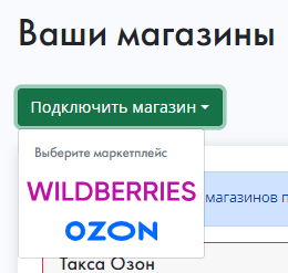 Для добавления магазина вам необходимо перейти в раздел Настройки -> Магазины. В открывшемся разделе нажимаете кнопку "Подключить магазин" и выбираете из какого маркетплейса вы хотите добавить магазин. На текущий момент доступны два варианта: Wildberries и Ozon.