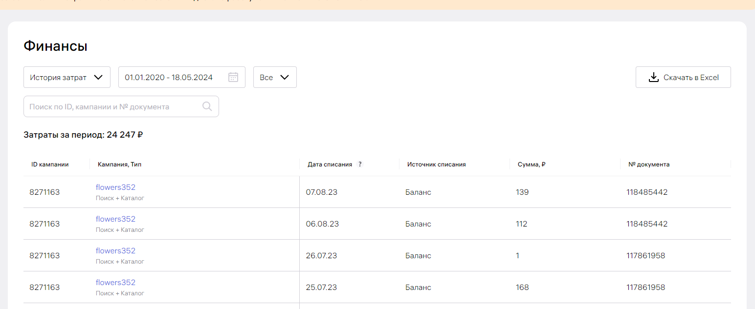 После этого перед вами откроется список всех финансовых операций по списанию средств за рекламу. Нас интересует "Источник списания" - Баланс.