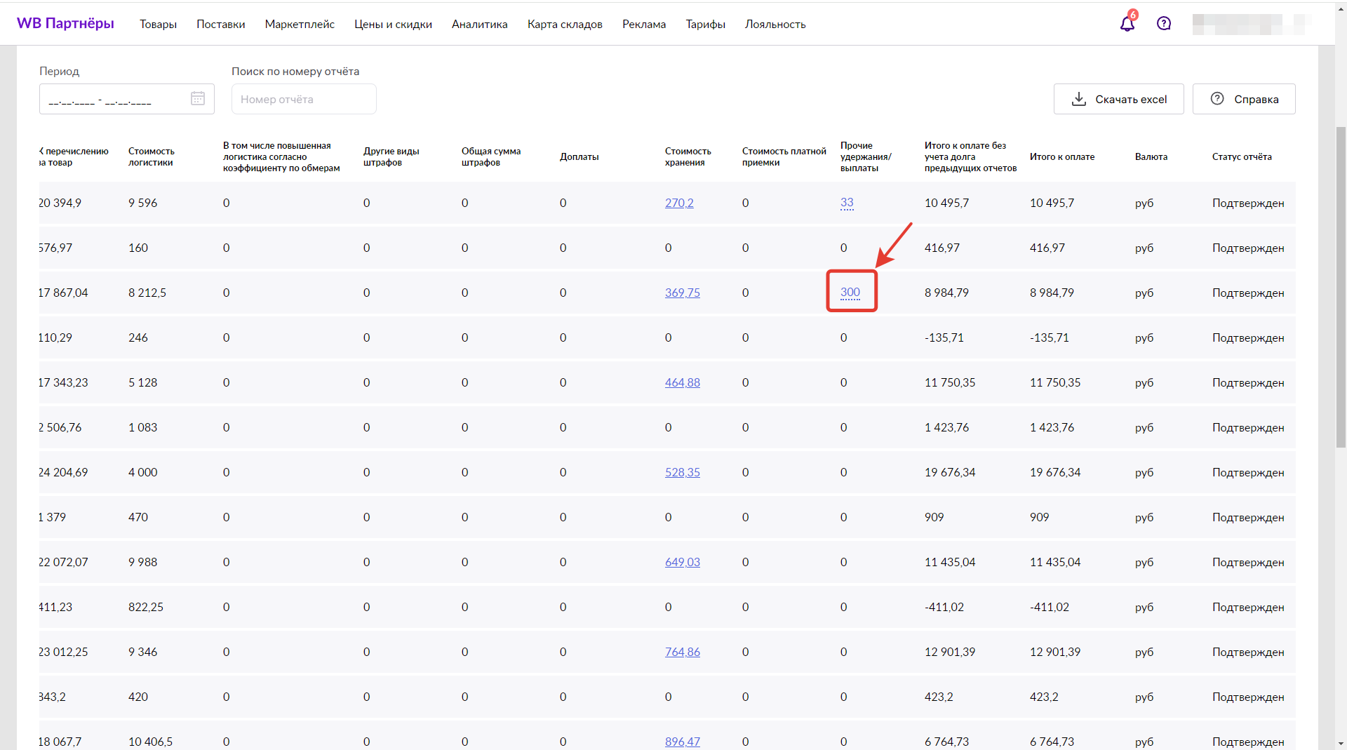 В разделе Финансовые отчёты в личном кабинете Widberries выбираете в списке необходимый отчет и прокручиваете вправо до столбца "Прочие удержания". Если данные присутствуют, то у вас в этом столбце будет число, отличное от 0.